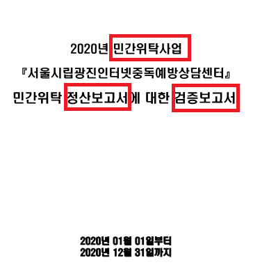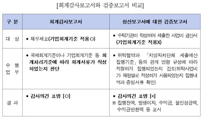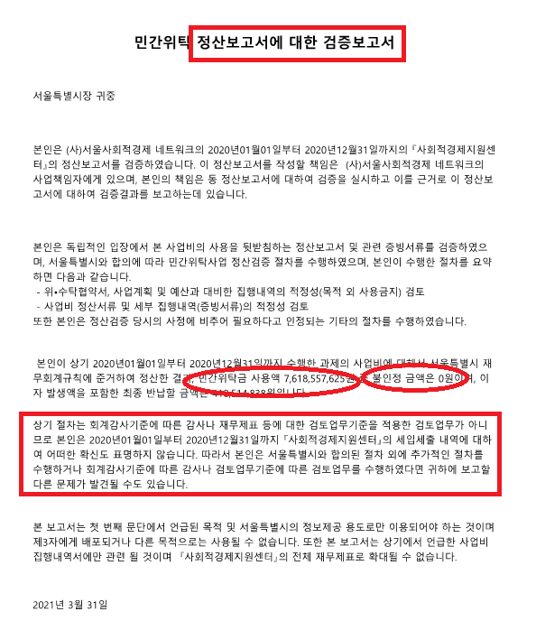 그러나 회계법인이 작성한 민간위탁사업자에 대한 ‘정산보고서에 대한 검증보고서’를 보면 재무제표가 아닌 사업비 정산서류 등의 적정성을 검토한 것이고 심지어 “상기 절차는 회계감사기준에 따른 감사나 재무제표 등에 대한 검토업무 기준을 적용한 검토업무가 아니므로 … 세입세출 내역에 대하여 어떠한 확신도 표명하지 않습니다”라고 하고 있으며, 감사의견도 표명하고 있지 않음이 확인된다. 즉, 회계법인이 작성한 ‘정산보고서에 대한 검증보고서’는 ‘회계감사’가 아니라는 것이 명명백백하다.