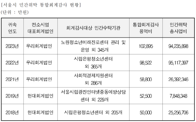 서울시가 최근 5개년간 실시한 민간위탁사업 통합회계감사 용역입찰공고 내용을 살펴보면 1430개 사업을 대상(총 민간위탁사업비 2조 4800억원)으로 회계감사용역비를 36억원을 지급한 것으로 확인된다.