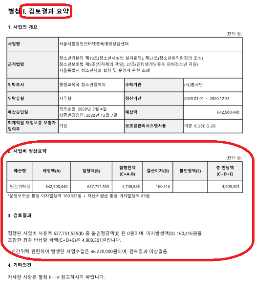 회계법인이 제출한 ‘검증보고서’ 문건을 보면 수탁기관이 제시한 결산서를 수정하지도 않고 검증결과 적발한 사항이 없는 등, 수탁기관이 작성한 예산과 집행, 잔액과 이월액 및 반납액 등을 이기한 것에 불과하고 이러한 문건은 형식과 내용에서 도저히 예산낭비를 막기위한 엄격한 회계감사보고서라고 볼 수 없다.