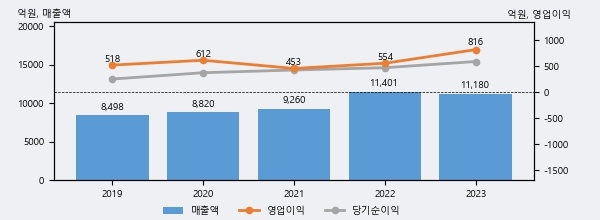 동성케미컬의 2023년 매출액은 1조 1180억으로 전년대비 -1.9% 하락했고, 영업이익은 816억으로 전년대비 47.4% 상승했다. 이 회사의 매출액 증감률과 영업이익 증감률은 각각 코스피 하위 45%, 상위 28%에 해당된다.