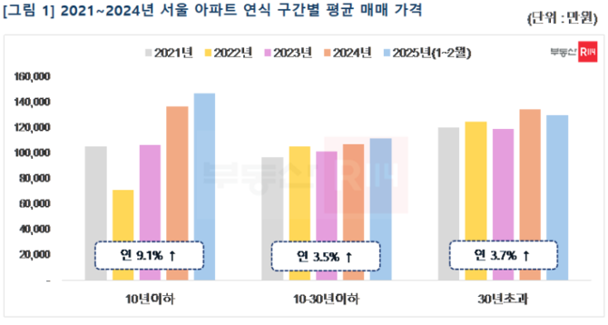 13일 부동산R114가 국토교통부 실거래가 자료를 바탕으로 2021~2024년 서울 아파트의 연식 구간별 매매 거래를 분석한 결과, 준공 10년 이하 아파트의 평균 매매 가격은 4년간 연평균 9.1% 상승하며 가장 높은 증가율을 기록했다. 그 다음으로, 30년 초과 아파트가 연평균 3.7% 상승하며, 10년 초과 30년 이하 아파트(3.5%↑)보다 가격 변동 폭이 컸다.
