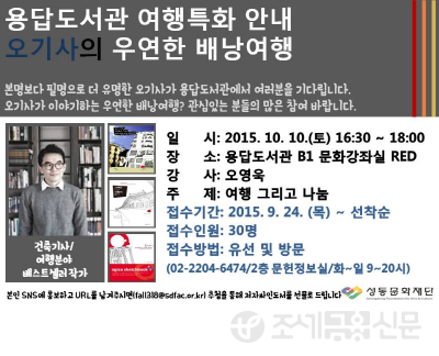 (조세금융신문=옥정수 기자) 성동문화재단(이사장 정원오) 용답도서관이 오는 10일 오후 4시 30분부터 오영욱 작가와 함께하는 ‘오기사의 우연한 배낭여행’을 개최한다.
