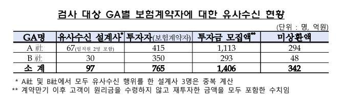 금융감독원은 지난해 12월부터 올해 2월까지 유사수신 연루 의혹이 제기된 2개 GA를 긴급 현장검사한 결과, 이들 GA 소속 설계사 97명이 보험영업을 빌미로 사회초년생 등 보험계약자 765명을 상대로 1천406억원의 유사수신 자금을 모집하고, 약 342억원은 상환하지 않은 사실을 적발했다고 23일 밝혔다.