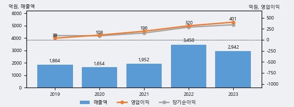태경비케이의 2023년 매출액은 전년대비 -14.7% 줄어든 2942억원이고, 영업이익은 전년대비 25.4% 늘어난 401억원을 기록했다. 이 회사의 매출액 증감률과 영업이익 증감률은 각각 코스피 하위 19%, 상위 37%에 해당된다.