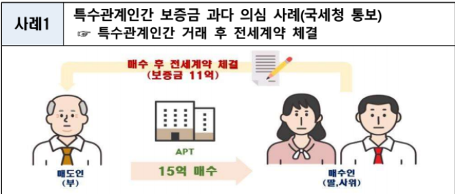 서울 한 아파트를 15억 원에 매수한 A씨. 그는 자기자금 4억 원과 더불어, 매도인을 임차인으로 하는 전세 계약(보증금 11억 원)을 체결했다. 매도인은 매수인의 장인어른으로 밝혀졌으며, 보증금이 지나치게 높아 편법증여 가능성이 제기됐다.