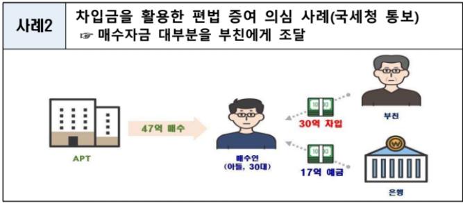 서울 ○○구에서 47억 원짜리 아파트를 구매한 B씨는 자기자금 17억 원 외에 30억 원을 부친에게 차입했다. 정부는 이를 편법증여로 의심하고, 불법 여부를 조사 중이다.