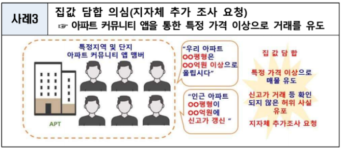 일부 아파트 단지에서는 온라인 커뮤니티에서 특정 가격 이하로 거래하지 않도록 유도하는 정황이 발견됐다. 이에 따라 정부는 지자체에 추가 조사를 요청한 상태다.