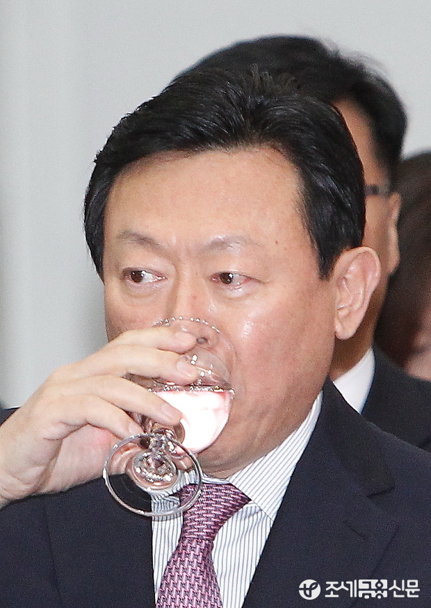 (조세금융신문=전한성 기자) 신동빈 롯데그룹회장이 12일 오전 인천 중구 운서동 롯데면세점 통합물류센터에서 열린 롯데면세점 비전 선포식에서 목을 축이고 있다.