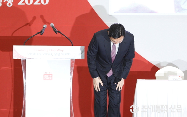 (조세금융신문=전한성 기자) 신동빈 롯데그룹회장이 12일 오전 인천 중구 운서동 롯데면세점 통합물류센터에서 열린 롯데면세점 비전 선포식에서 PPT 발표에 앞서 인사를 하고 있다.