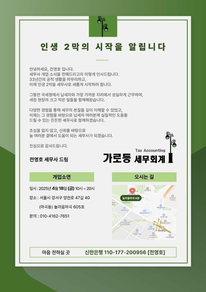전영호 세무사는 오는 4월 18일 오전 10시부터 서울시 강서구 양천로 47길 40 놀라움마곡 605호실에서 지인들을 모시고 조촐한 개업소연을 갖는다.