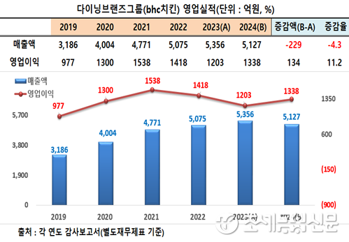 다이닝브랜즈그룹㈜이 금감원 전자공시 시스템에 신고한 자료에 따르면 bhc치킨의 별도재무제표 기준 매출은 전년대비 4% 감소하고 영업이익은 11% 증가했다.