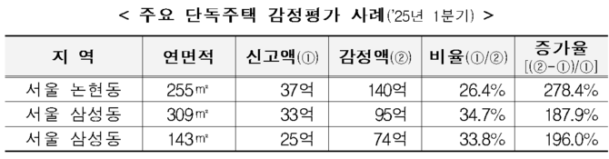 고가 주택의 경우 단독주택이 아파트 등 다른 형태의 주택보다 신고액 대비 감정가액 증가율(151%)이 높았다. 쉽게 말해면 단독주택의 부실신고가 아파트보다 더 심했다는 뜻이다.