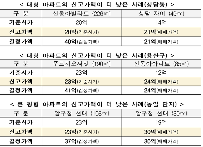 청담 신동아빌라트(226㎡)의 신고액은 기준시가를 이용해 20억원으로 신고됐으나, 인근 청담 자이 중․소형(49㎡)의 매매가액 21억원보다 낮았다. 이들 중‧대형 아파트는 주변에 매매사례가 거의 없다는 점을 악용해 신고가액을 낮췄다.