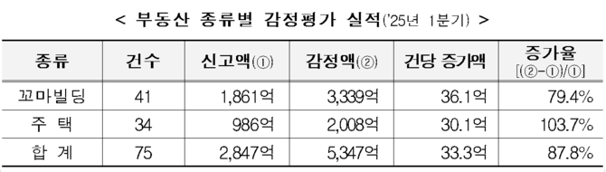 올해 1분기 국세청은 총 75건의 부동산을 감정평가해 신고액(2847억원)보다 87.8%가 높은 5347억원)으로 과세했다.