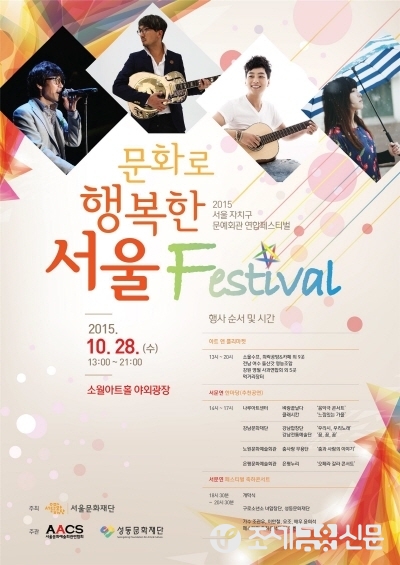 (조세금융신문=옥정수 기자) 서울문화예술회관연합회와 성동문화재단이 주최하고 서울문화재단이 후원하는 ‘문화로 행복한 서울 2015’ 페스티벌이 오는 28일 성동구 소월아트홀 야외광장에서 열린다.