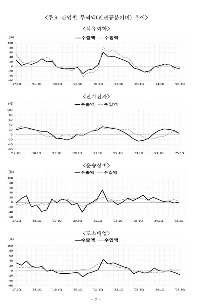 전통 수출산업의 부진도 이번 통계에서 뚜렷하다. 광제조업 수출은 -0.5%, 수입은 -2.7%로 감소세를 보였다. 석유화학과 금속제품의 하락이 주요 원인이며, 이는 글로벌 제조업 둔화 및 원자재 가격 하락과 맞물린 결과로 분석된다.