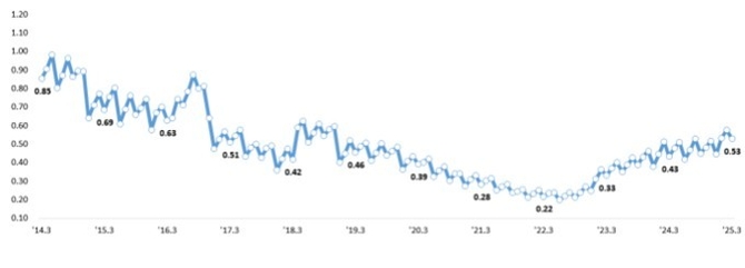 21일 금융감독원에 따르면 지난 3월 말 국내은행의 원화대출 연체율(1개월 이상 원리금 연체기준)은 0.53%로 전월 말 대비 0.05%p 하락, 작년 동월말과 비교해 0.10%p 상승한 수치를 보였다.