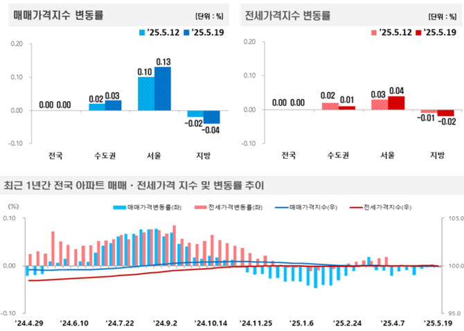 한국부동산원이 22일 발표한 ‘2025년 5월 3주 주간 아파트가격 동향’에 따르면, 서울 아파트 매매가격은 전주(0.10%)보다 상승폭이 커진 0.13%를 기록했다. 이는 올해 들어 최고 수준의 주간 상승률 중 하나다. 특히 서초구(0.32%), 송파구(0.30%), 강남구(0.26%) 등 동남권 3개 구와 용산구(0.16%)가 서울 상승세를 견인했다.