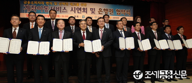 (조세금융신문=전한성 기자) '금융소비자의 편의 및 제고를 위한 계좌이동서비스 시연회 및 은행권 협약식'이 29일 오후 경기도 성남시 금융결제원 분당센터에서 열린 가운데 시중은행장들이 기념촬영을 하고 있다.