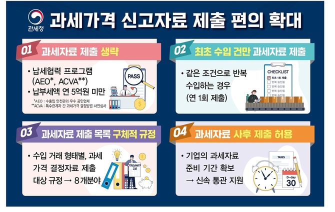 예컨대 AEO(수출입 안전관리 우수업체)나 ACVA(특수관계자 사전심사 대상)와 같은 납세협력 프로그램 가입 기업, 그리고 전년도 납세실적 5억원 미만의 소규모 수입기업에 대해서는 과세자료 제출 자체를 생략할 수 있도록 했다.
