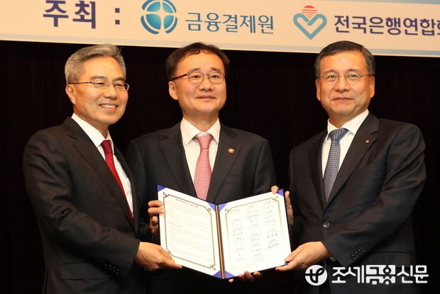 (조세금융신문=전한성 기자) '금융소비자의 편의 및 제고를 위한 계좌이동서비스 시연회 및 은행권 협약식'이 29일 오후 경기도 성남시 금융결제원 분당센터에서 열린 가운데 하영구(왼쪽부터) 전국은행연합회장, 정찬우 금융위원회 부위원장, 김종화 금융결제원장이 협약서를 들고 기념촬영을 하고 있다.