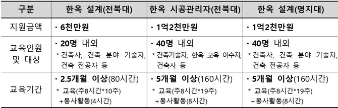 교육과 관련한 자세한 내용은 전북대 산학협력단 한옥건축사업단(gochang.jbnu.ac.kr/gochang/index.do)과 명지대 자연미래교육원 한옥 R&D센터(ice2.mju.ac.kr) 웹페이지에서 확인할 수 있다.