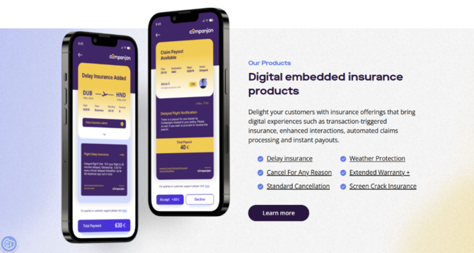 Companjon은 B2B2C 임베디드 보험을 위한 시장 내 최초의 동적 엔진을 개발하였다. AI와 머신 러닝을 활용하여 구매자 경험을 토대로 보험 상품의 모든 기능(보험 준수 사항, 혜택 계획, 청구 혹은 요구 사항 등)에 대한 조정이 가능하다.