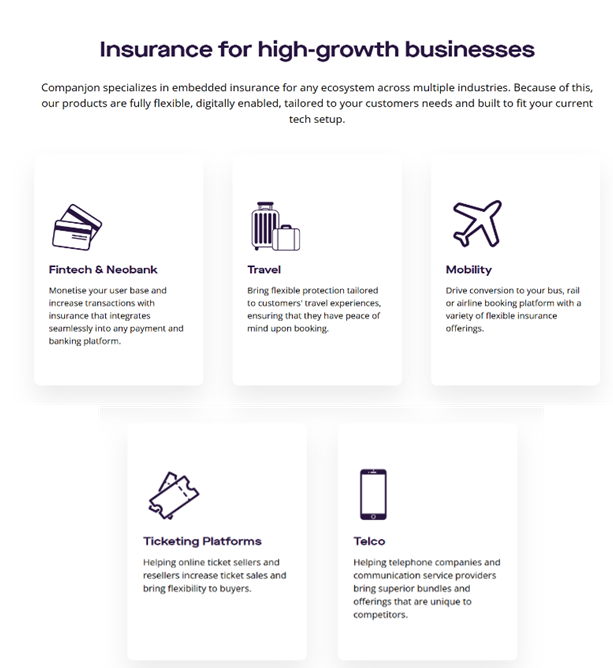 Companjon의 주력 보험상품은 크게 고성장 기업을 위한 보험과 디지털 임베디드 보험상품으로 나뉘어져 있다.