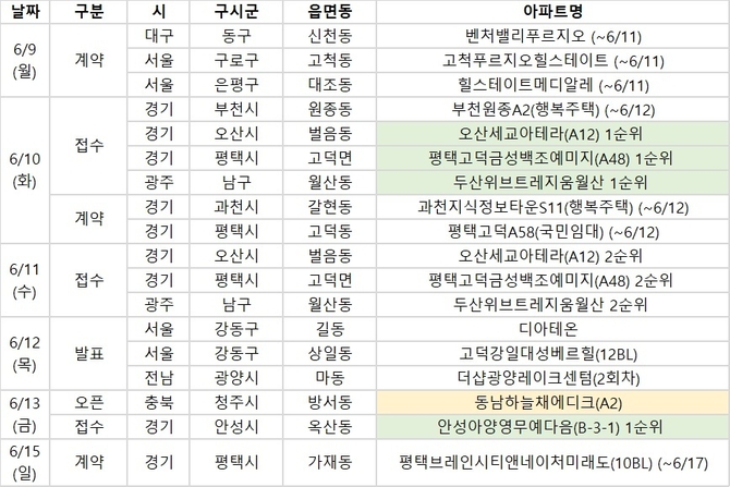 5일 부동산R114에 따르면, 6월 둘째 주에는 전국 4개 단지 총 1,944가구(일반분양 1,223가구)가 분양을 시작한다.
