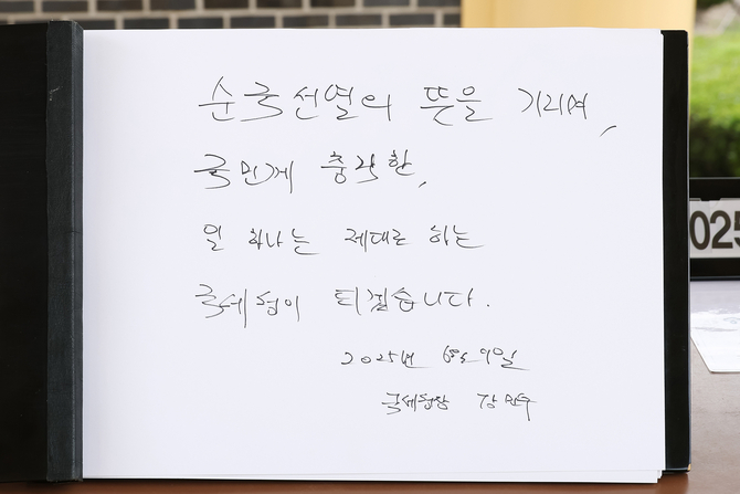 강 청장은 방명록에 '순국선열의 뜻을 기리며, 국민께 충직한, 일 하나는 제대로 하는 국세청이 되겠습니다"라고 기록했다.