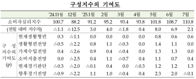 소비 심리는 개선세가 지속됐다. 7월 소비자심리지수(CCSI)는 110.8로, 6월보다 2.1p 올라 지난 2021년 6월(111.1) 이후 4년여 만에 최고치를 경신했다.
