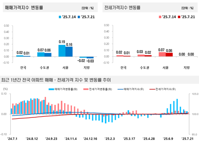 한국부동산원이 24일 발표한 ‘2025년 7월 3주 주간 아파트가격 동향’에 따르면, 서울 아파트 매매가격은 전주 대비 0.16% 상승했다. 이는 지난주(0.19%)보다 상승폭이 줄어든 수치다. 전국 기준으로는 0.01% 상승하며, 4주 연속 오름폭 둔화세를 기록했다.