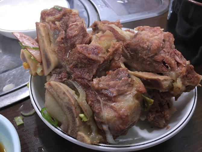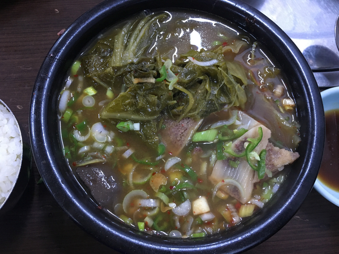 뚝배기 안엔 큼지막한 소뼈와 선지, 우거지가 푸짐하게 들어 있었다. 서울식 해장국 특유의 덜 맵고 자극적이지 않은 국물, 진하게 우러난 사골 육수에 된장을 풀어 간을 맞추고, 우거지로 달큰한 맛을 낸 국물은 속을 편안히 감쌌다. 그 위에 선지가 올라가면 비로소 서울식 해장국이 완성된다.
