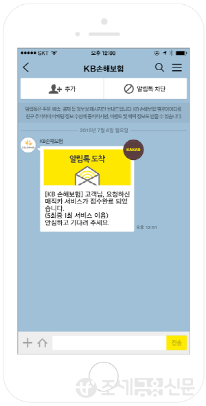 (조세금융신문=옥정수 기자) KB손해보험(대표이사 사장 김병헌)이 오는 23일부터 각종 보험계약 안내사항을 카카오톡 메시지로 발송하는 ‘카카오톡 알림톡’ 서비스를 도입한다.