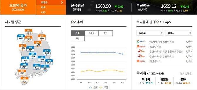 9일 한국석유공사 유가정보시스템 오피넷에 따르면 8월 첫째 주(3∼7일) 전국 주유소 휘발유 평균 판매가는 지난주보다 L당 2.2원 오른 1천669.9원이었다.