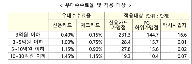 13일 금융위원회에 따르면 우대수수료율이 적용되는 영세·중소신용카드가맹점은 306.8만개다. 이와 함께 결제대행업체를 통해 카드결제를 수납하는 결제대행업체 하위가맹점 186.4만개, 교통정산사업자를 통해 카드결제를 수납하는 개인·법인 택시사업자 16.6만개에 대해서도 우대수수료율이 적용된다.