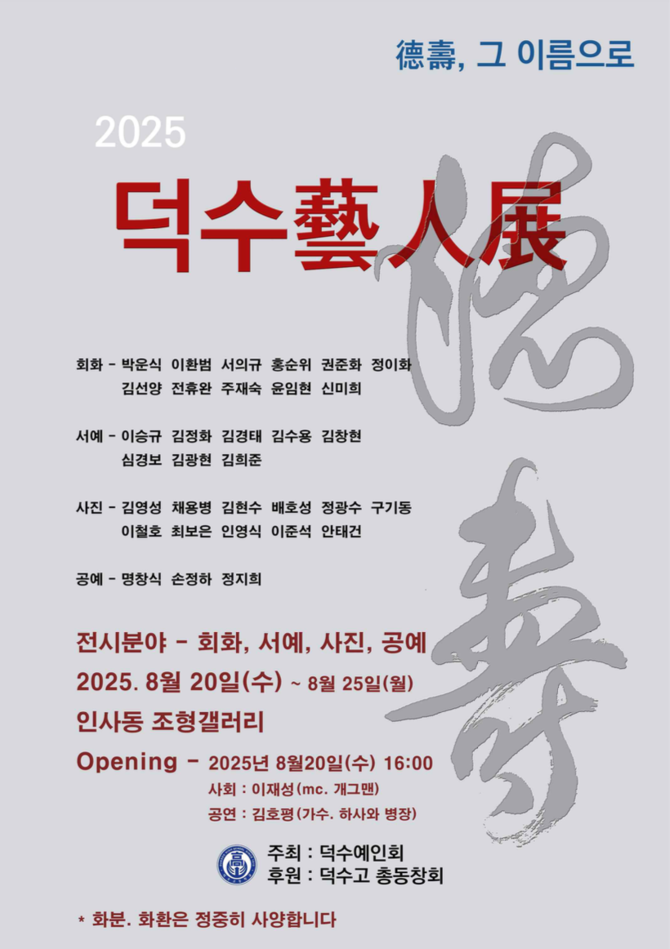 (조세금융신문=이유린 기자) 덕수고등학교 동문 예술인들의 모임인 ‘덕수예인회’(회장 권준화)가 오는 8월 20일 부터 25일까지 인사동 ‘조형갤러리’에서 〈2025 덕수예인전〉을 개최한다.