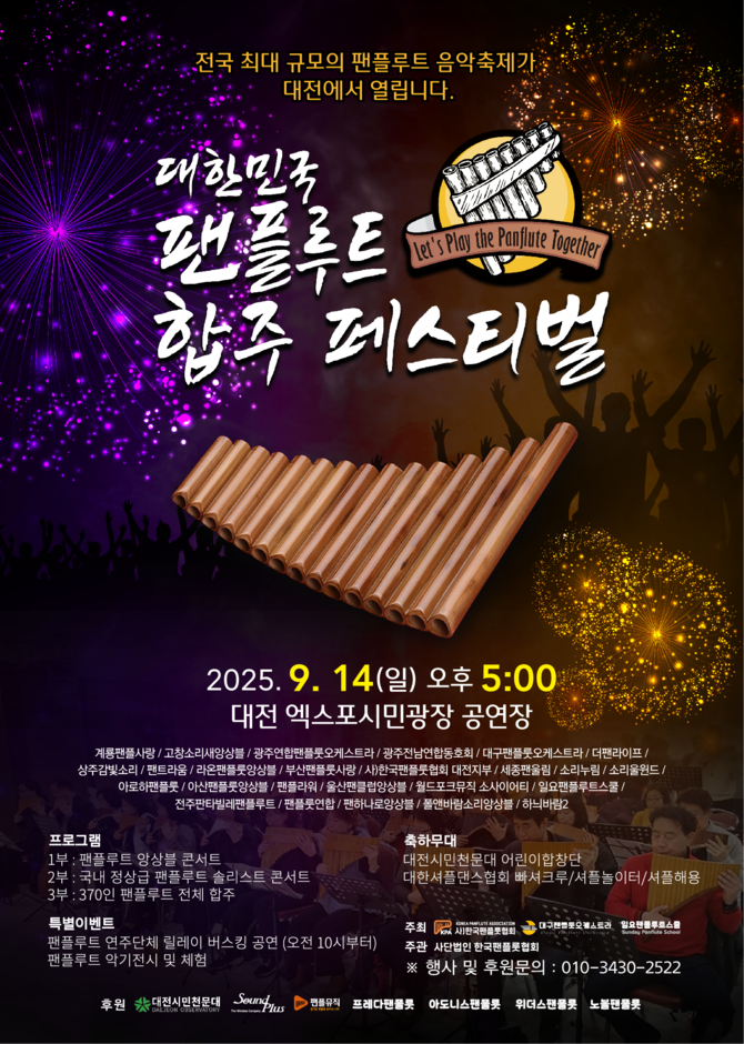 이번 행사는 사단법인 한국팬플룻협회, 일요팬플루트스쿨, 대구팬플룻오케스트라가 공동 주최한다. 주최 측은 “국내 팬플루트의 위상을 높이고 전국 팬플루트 애호가들이 하나로 모여 결집력을 보여주는 기회가 되길 바란다”며 기획 의도를 밝혔다.