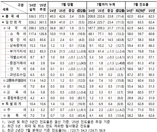 더욱이 올해 7월 누적 세수진도율은 62.5%로, 지난해 결산 기준 세수달성률(62.0%)과 비슷한 수준이다. 이 말은 지난해 수준 정도만 유지해도 심각한 결손이 발생하지 않는다는 뜻이다.