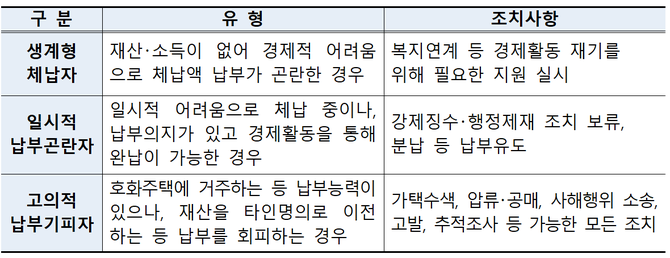 국세청은 현장확인 등을 거친 체납자의 경제적 여건과 생활실태 확인 결과를 종합해 ▲생계형 체납자 ▲일시적 납부 곤란자 ▲고의적 납부 기피자로 분류하고 유형에 따른 조치를 실시할 계획이다.