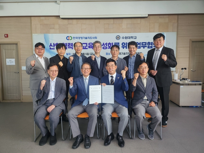 협약식은 5일 한국경영기술지도사회 회의실에서 열렸으며, 한국경영기술지도사회에서는 권형남 회장, 김경만 상근부회장, 강호익 부회장, 편만리 중소기업혁신연구원장, 홍한표 기업진단감리위원장, 김학주 경기남부지회 부지회장이 참석했다. 수원대학교에서는 임선홍 부총장, 홍진환 경영대학원장, 김호영 교수, 박상섭 교수가 자리했다.