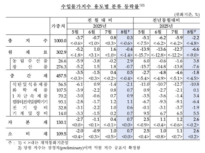 원재료는 원유 등 광산품(-0.7%)을 중심으로 0.4% 내렸고, 중간재는 컴퓨터·전자·광학기기(1.1%), 화학제품(0.7%) 등이 오르면서 0.5% 상승했다. 자본재·소비재 역시 각각 0.7%씩 올랐다. 세부 품목 중에선 커피(13.4%), 안료(3.8%), 기타귀금속정련품(2.4%), 플래시메모리(1.0%), 냉동수산물(1.1%) 등 상승 폭이 컸다.