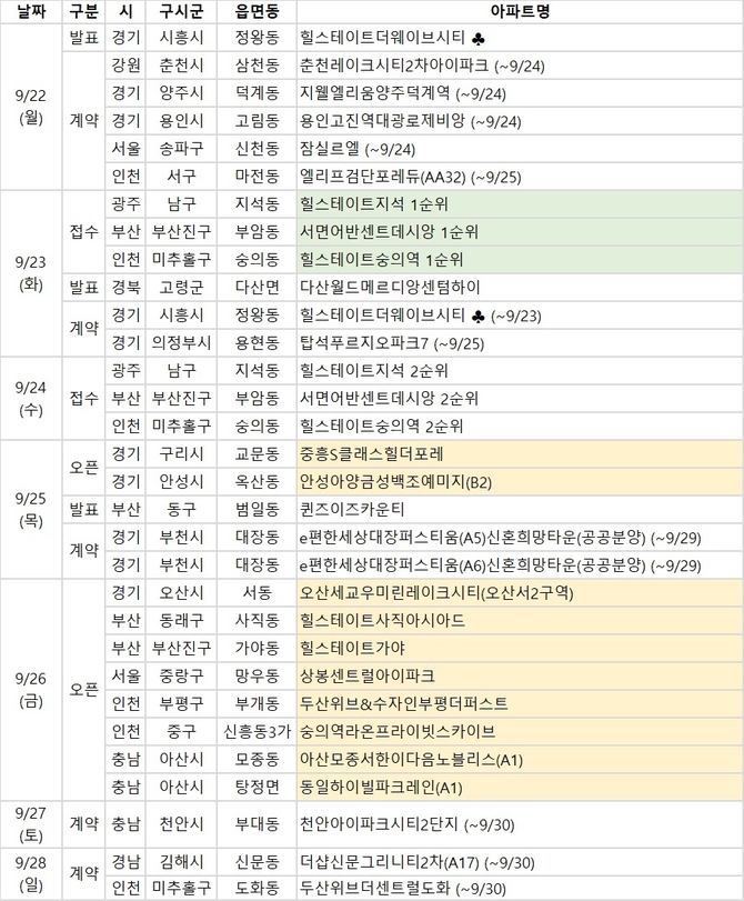9월 넷째 주는 공급 규모는 적지만 수도권 및 광역시 중심의 알짜 입지가 포함돼 청약 열기는 이어질 전망이다. 업계 관계자는 “서울은 재개발·재건축 물량이 늘고, 지방 광역시는 교통망 확충과 생활 인프라 개선이 호재로 작용하고 있다”며 “다만 금리와 대출 규제가 변수로 남아 있어 청약 수요는 입지 선호도가 높은 단지에 집중될 것”이라고 내다봤다.