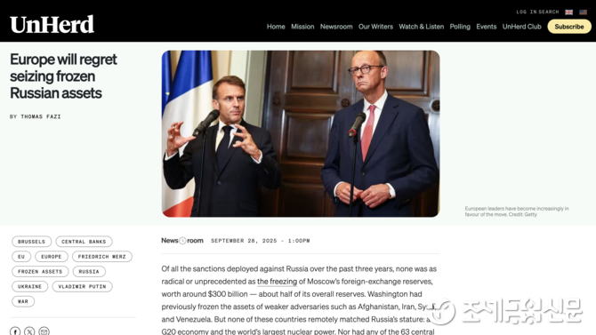 영국 매체 <언허드(Unherd)>의 칼럼니스트 토마스 파지(Thomas Fazy)는 29일(런던 현지시간) 칼럼에서 “EU의 러시아 자산 몰수는 또 다른 놀라운 자기 파괴 행위이며, EU 수입원을 박탈하는 결과를 초래할 것이 자명하고 금융가에서 이미 이런 유로화 불신이 나타나고 있다”면서 이 같이 주장했다.