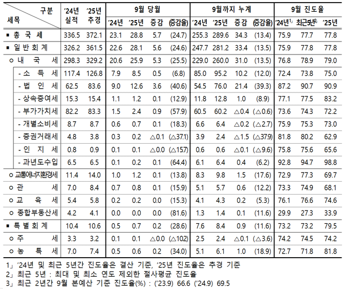 2025년도 9월 누적 기준, 가장 큰 변동이 있었던 건 법인세다.
