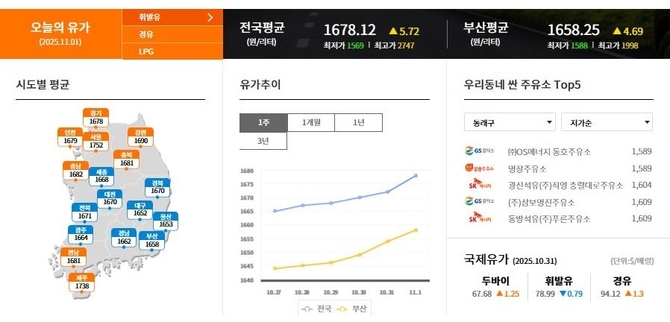 1일 한국석유공사 유가정보시스템 오피넷에 따르면 10월 다섯째 주(27∼30일) 전국 주유소 휘발유 평균 판매가는 지난주보다 L당 5.4원 오른 1천666.5원이었다.