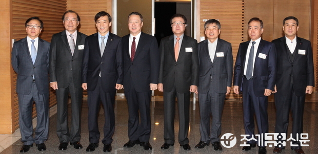 (조세금융신문=전한성 기자) '이주열 한국은행 총재 초청 최고경영자(CEO) 조찬간담회'가 17일 오전 서울 중구 세종대로 대한상공회의소에서 열린 가운데 이 총재(왼쪽 세번째)와 박용만(왼쪽 네번째) 대한상공회의소 회장이 참석자들과 기념촬영을 하고 있다.