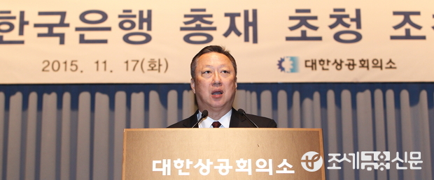 (조세금융신문=전한성 기자) '이주열 한국은행 총재 초청 최고경영자(CEO) 조찬간담회'가 17일 오전 서울 중구 세종대로 대한상공회의소에서 열린 가운데 박용만(두산그룹 회장) 대한상공회의소 회장이 축사를 하고 있다.