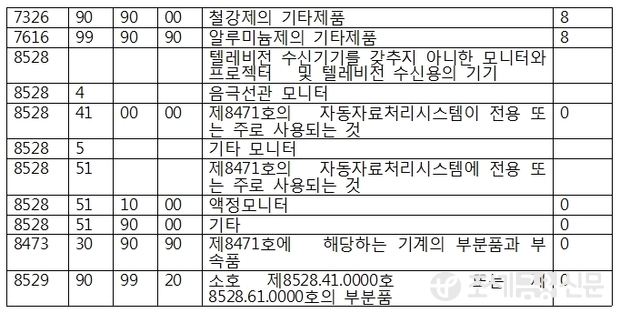 중국으로부터 모니터스탠드를 수입해 국내에 판매하고 있는 A사는 평판모니터 스탠드를 수입신고하면서 품목번호를 HSK 8529.90-9920(WTO협정세율 0%)호 또는 HSK8473.30-9090(WTO협정세율 0%)호로 수입신고하고 통관했다.