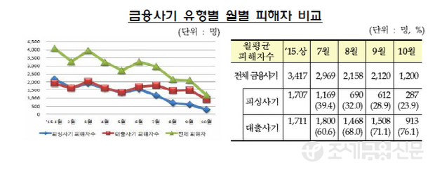 하반기 들어서 대출사기 피해자수(5천689명)가 피싱사기 피해자수(2천758명)를 넘어섰고 피해액도 금융사기 전체 피해액의 절반수준(10월 60.0%)을 초과했다.